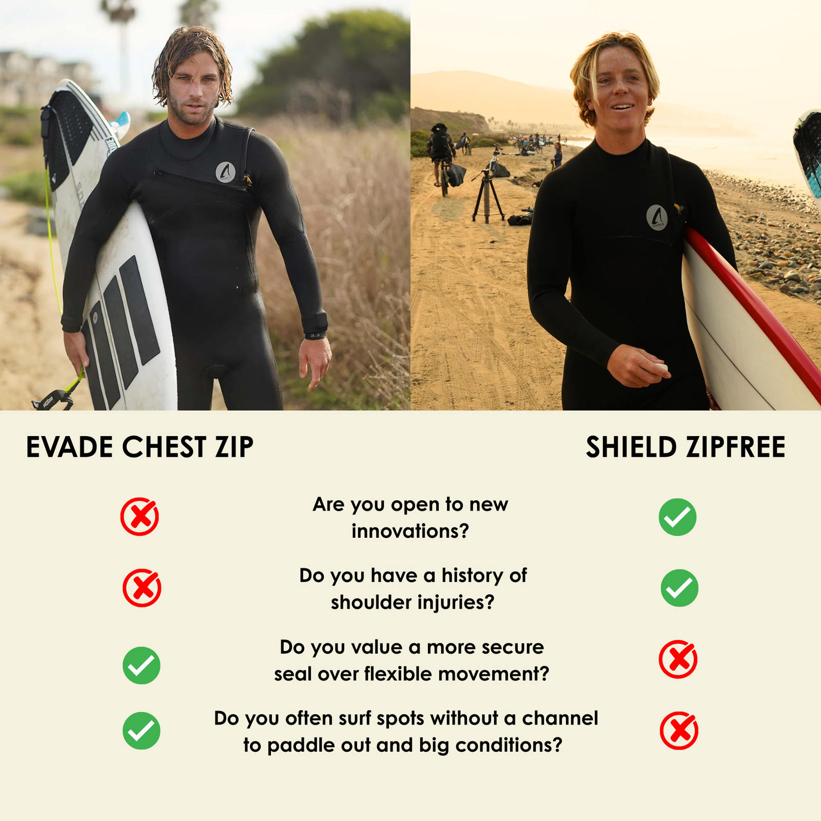 Firstly, any of the wetsuits from either collection are likely to be the best wetsuit you've ever surfed in. Of course we would say this, but our customer reviews also give the same story. So you can rest assured that the sooner you get into either a chest zip or zipfree ISURUS wetsuit, the sooner your surfs will improve.
